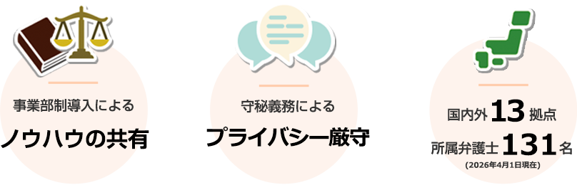 借金問題には、離婚や相続など様々な問題が関係していることも少なくありません。私たちの事務所では、 “事業部制”を導入して所属弁護士の専門性強化に努めています。各分野の専門的な知識やノウハウの蓄積・共有により、さまざまなニーズにお応えすることができます。