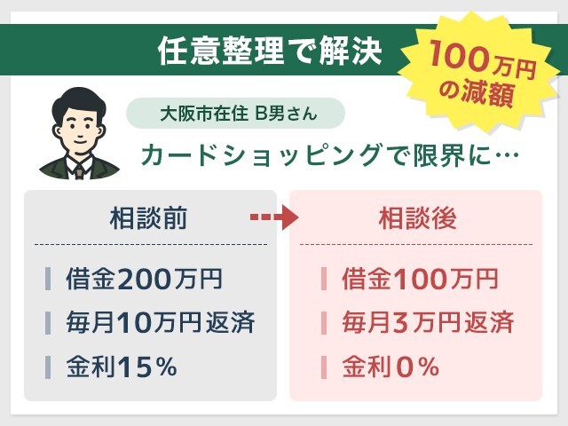 カード会社数社からの借り入れがあり、借金総額が50万円から300万円程度の案件において、将来利息のカットや返済期間の再交渉を行い、無理のない支払い計画へと導いた実績が豊富です。